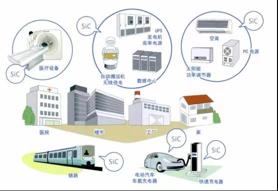 例如,家庭里的SiC有PC電源、太陽能發(fā)電功率調(diào)節(jié)器(家庭用)、空調(diào)等;工業(yè)中的SiC有數(shù)據(jù)中心、UPS、工廠搬運(yùn)機(jī)器人、高頻感應(yīng)加熱設(shè)備(IH)與高頻電源、太陽能發(fā)電功率調(diào)節(jié)器(太陽能發(fā)電站等非家庭用)等;城市里的SiC有電動(dòng)汽車(車載充電器)、快速充電站、發(fā)電機(jī)、醫(yī)療診斷設(shè)備等。