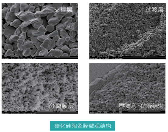 碳化硅陶瓷膜(SIC)采用重結(jié)晶技術(shù)通過高溫?zé)Y(jié)而成,其分離層、過渡層以及多孔支撐層全部為SiC材料,其過濾精度多為微濾和超濾。按膜結(jié)構(gòu)不同一般分為管式膜和平板膜。管式膜由分離層、過渡層和支撐層組成,平板膜由分離層和支撐層組成。