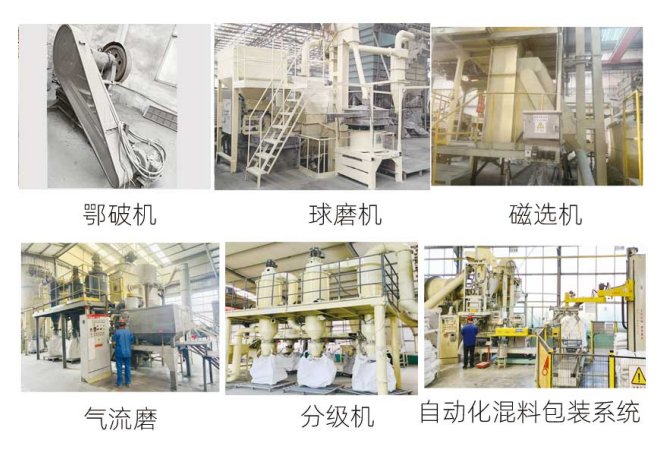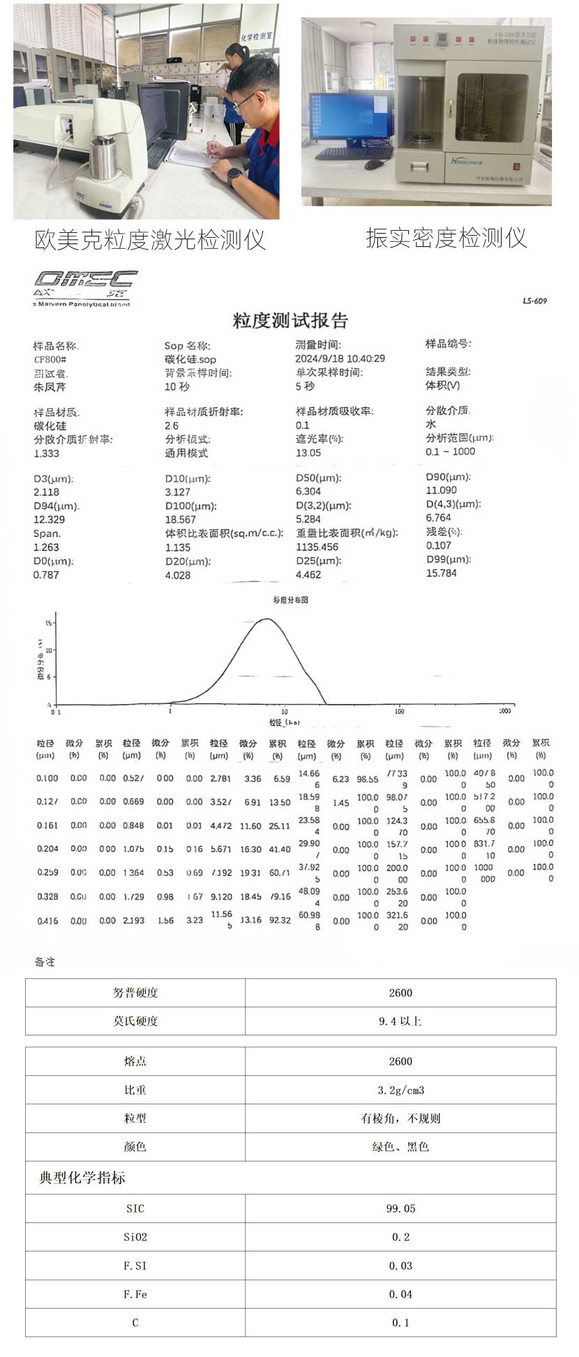 發(fā)泡陶瓷用碳化硅微粉加工工藝及加工設(shè)備: 碳化硅原塊經(jīng)過(guò)鄂破機(jī)鄂破、粉碎機(jī)粉碎后的 5mm-0的粗顆粒,進(jìn)入球磨機(jī)研磨過(guò)篩成 60#-0的細(xì)顆粒,再磁選后再經(jīng)過(guò)雷蒙磨、氣流磨等繼續(xù)深加工,使碳化硅顆粒達(dá)到 30um 到 5um 的微粉再進(jìn)行氣流分級(jí)、篩分過(guò)篩等工序,逐步生產(chǎn)出符合行業(yè)標(biāo)準(zhǔn)要求或者客戶標(biāo)準(zhǔn)要求的系列碳化硅微粉型號(hào)。 發(fā)泡陶瓷用碳化硅微粉應(yīng)用及優(yōu)勢(shì): 發(fā)泡陶瓷是將一種或多種陶瓷原料、發(fā)泡劑、粘結(jié)劑等混合后,在加熱的條件下形成氣孔、膨脹、硬化而制成的一種具有多孔性質(zhì)的材料。由于其多孔性質(zhì),發(fā)泡陶瓷具有輕質(zhì)、隔音、保溫、吸水性能等優(yōu)點(diǎn),廣泛應(yīng)用于建筑材料、過(guò)濾材料、散熱材料等領(lǐng)域。 碳化硅在發(fā)泡陶瓷中的應(yīng)用: 作為發(fā)泡劑 在發(fā)泡陶瓷的生產(chǎn)過(guò)程中,需要加入適量的發(fā)泡劑來(lái)形成氣泡,從而形成多孔材料。碳化硅是一種良好的發(fā)泡劑,可以在生產(chǎn)過(guò)程中釋放大量的氣體,幫助形成氣泡。 碳化硅在發(fā)泡陶瓷生產(chǎn)中的應(yīng)用案例: 1、發(fā)泡陶瓷保溫材料 發(fā)泡陶瓷保溫材料是將粘土、煤粉、發(fā)泡劑等材料混合后在高溫下燒結(jié)而成的,具有良好的隔熱性能。在生產(chǎn)過(guò)程中加入一定量的碳化硅,能夠使材料的硬度和耐熱性更高。 2、濾芯發(fā)泡陶瓷濾芯是一種用于水處理、電子、食品、制藥等領(lǐng)域的過(guò)濾器,具有對(duì)流動(dòng)液體的過(guò)濾和分離效果。在濾芯的生產(chǎn)過(guò)程中加入一定量的碳化硅,能夠增加濾芯的抗磨損性以及濾芯的更高穩(wěn)定性。 發(fā)泡陶瓷用碳化硅檢測(cè)設(shè)備及報(bào)告: 產(chǎn)品包裝展示:
